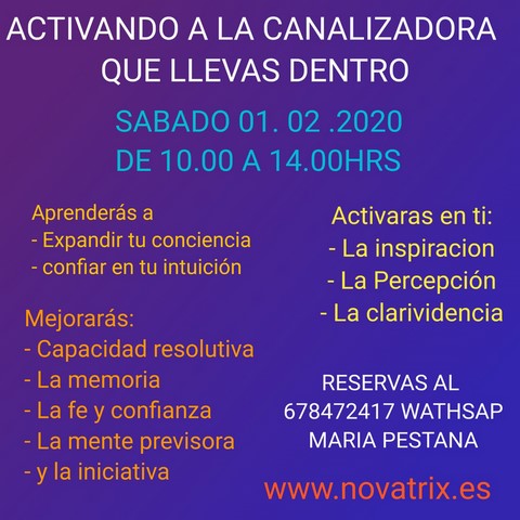 Solo quiero informarte de que este sábado día 1 repetiré el taller ACTIVANDO LA CANALIZADORA QUE LLEVAS DENTRO. Este taller está enfocado a toda persona que quiera EMPODERARSE aprendiendo a reconocer su propia intuición. Taller apto tanto para hombre como mujeres. Si te vibra y quiera reservar tu plaza o necesitas más información, por favor envíame un wathsap al 678372417.