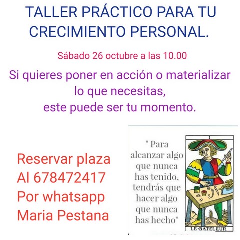Recordarte que este sábado de 10.00 a 14.00hras impartire el taller del Sendero del Mago, en el cual trabajaremos la forma de conseguir poner en acción todo lo que hasta ahora no he podido unificando lo que pienso con lo que siento y con el como actuó. Un trabajo muy práctico para conseguir materializar lo que realmente me hace feliz. Si te vibra reserva tu plaza al 678472417 por wathsapp. Gracias por existir. MARIA PESTANA